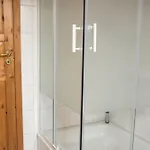 Zur Ausstattung des Badezimmers gehören auch eine Dusche.